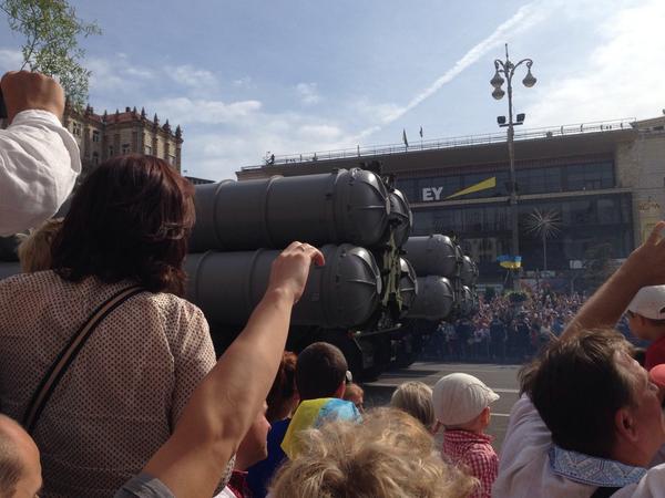 Soldiers, some due to head directly to the front where government forces are fighting pro-Russian separatists, staged a marchpast on Kiev's Independence Square followed by a parade of armoured vehicles armed with anti-tank weapons and trucks towing missile systems.