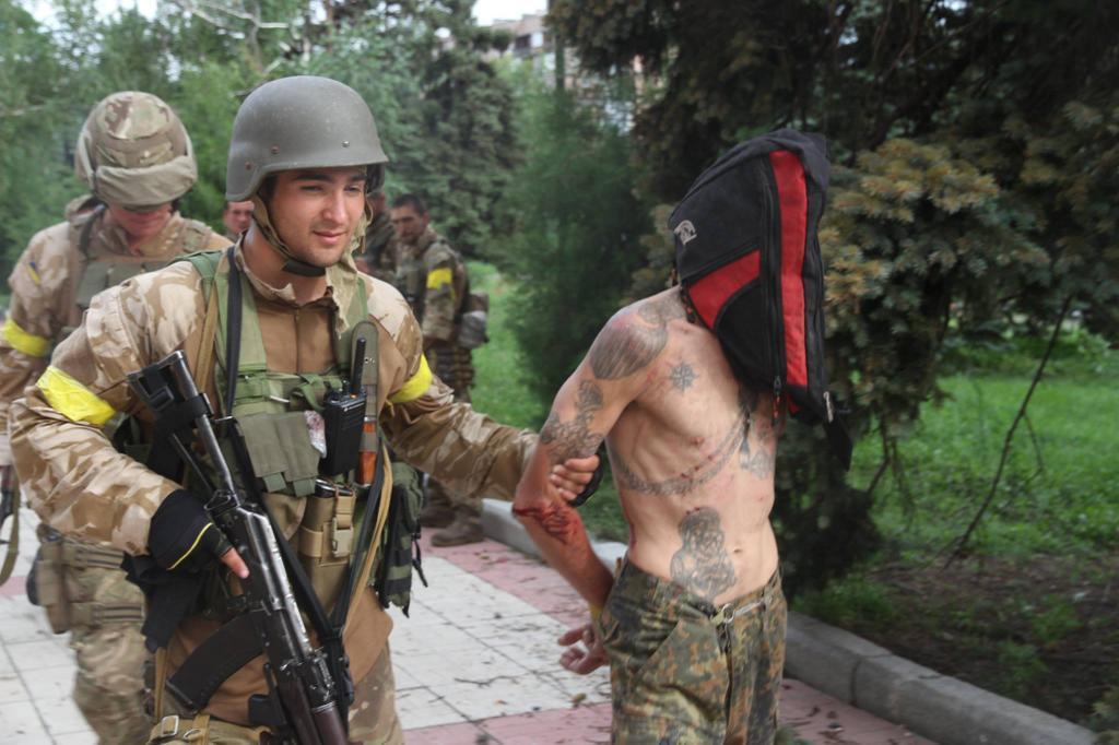 Ukraine forces arresting pro Russian rebels found hiding in the abandoned flats and houses.